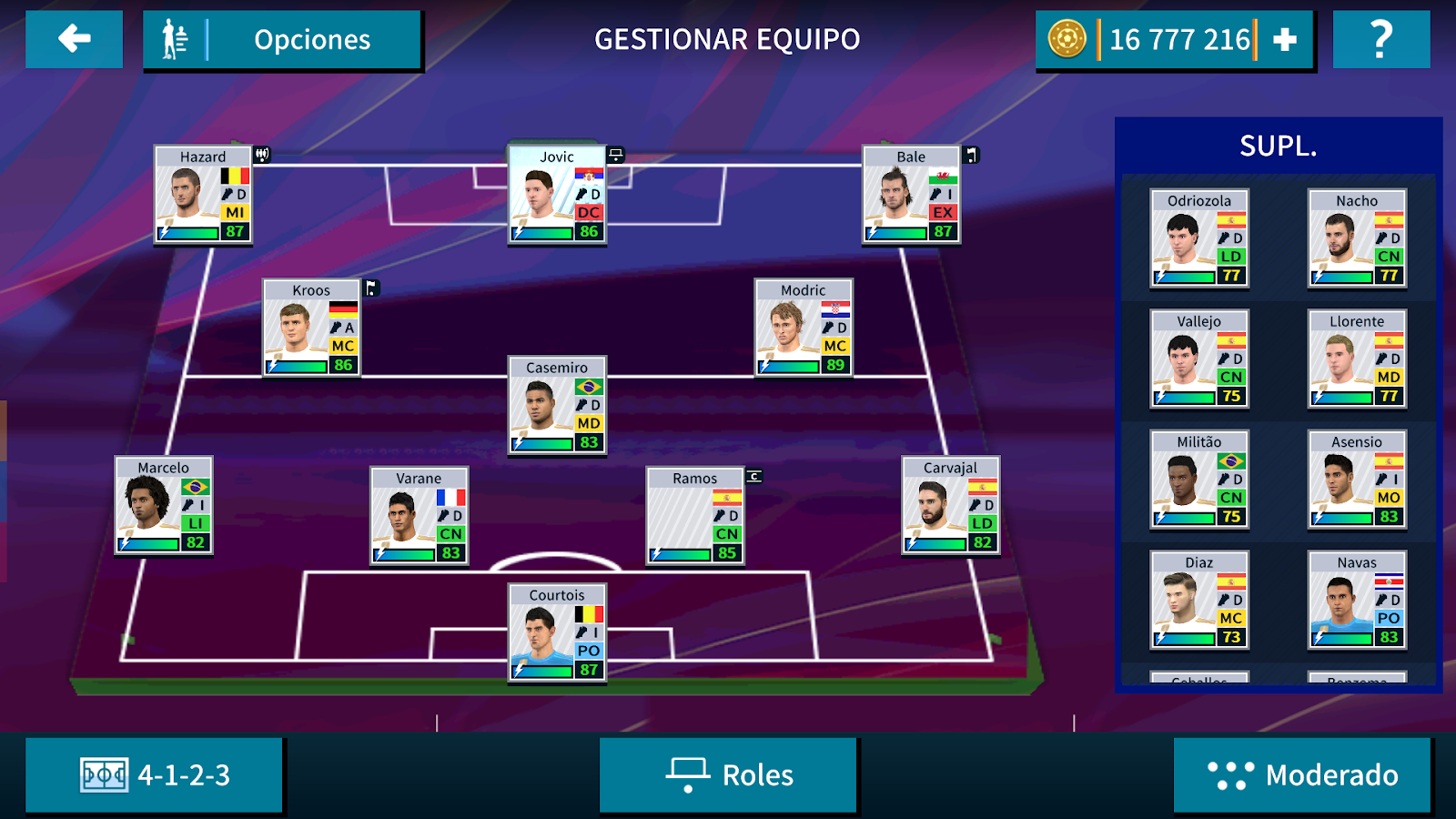 - الواجهة اللعبة:خلفية والقوائم معدلة والصور الخاصة بفريق ريال مدريد.